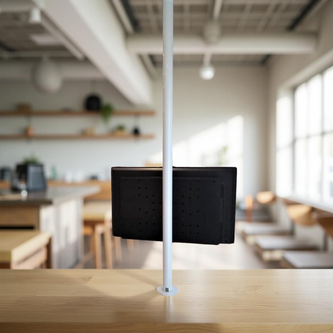 Suporte inox com giro 360º e regulagem de altura 1,45m a 2m. Fixação teto e móvel com chapa universal ou vidro temperado.